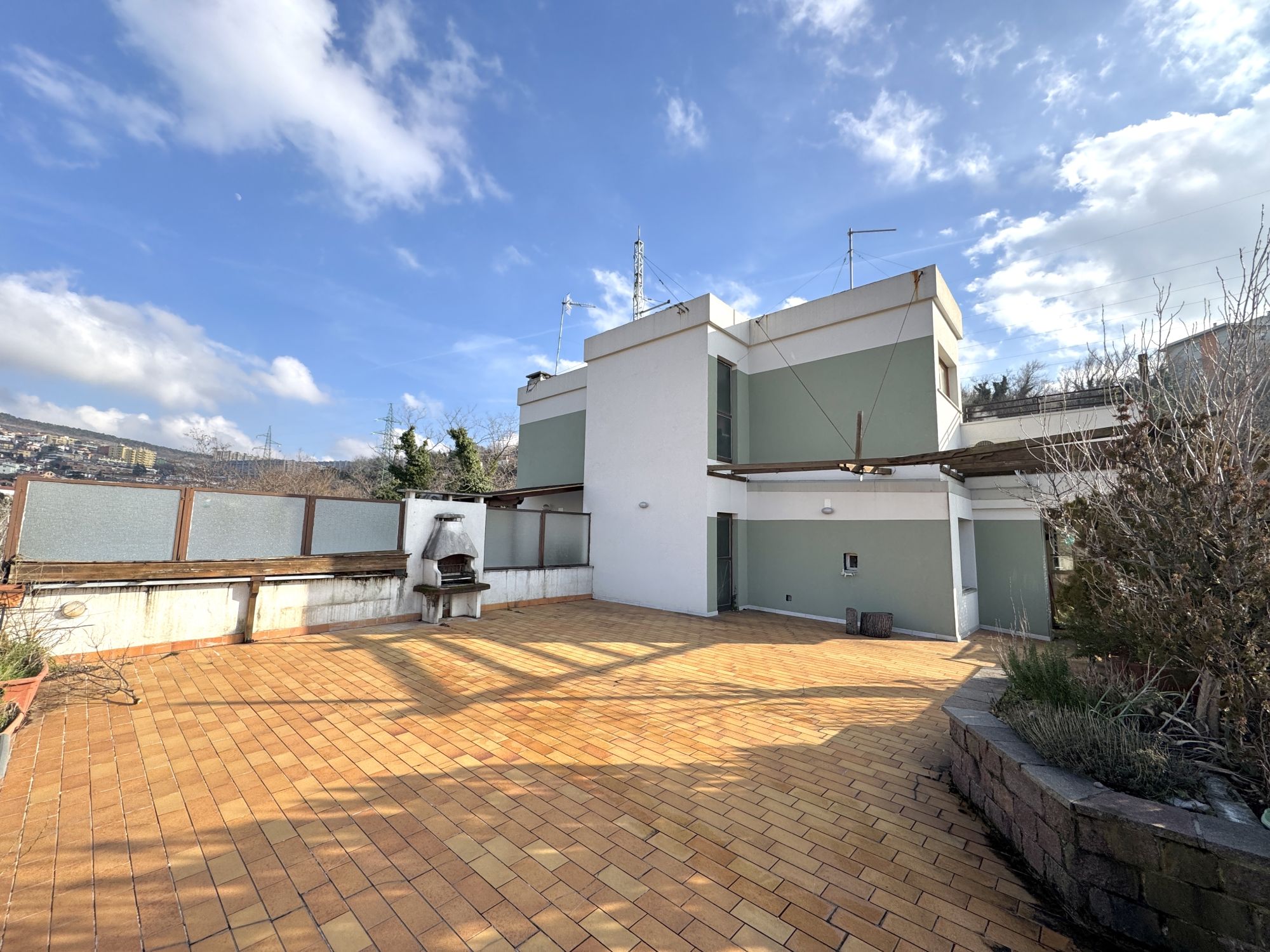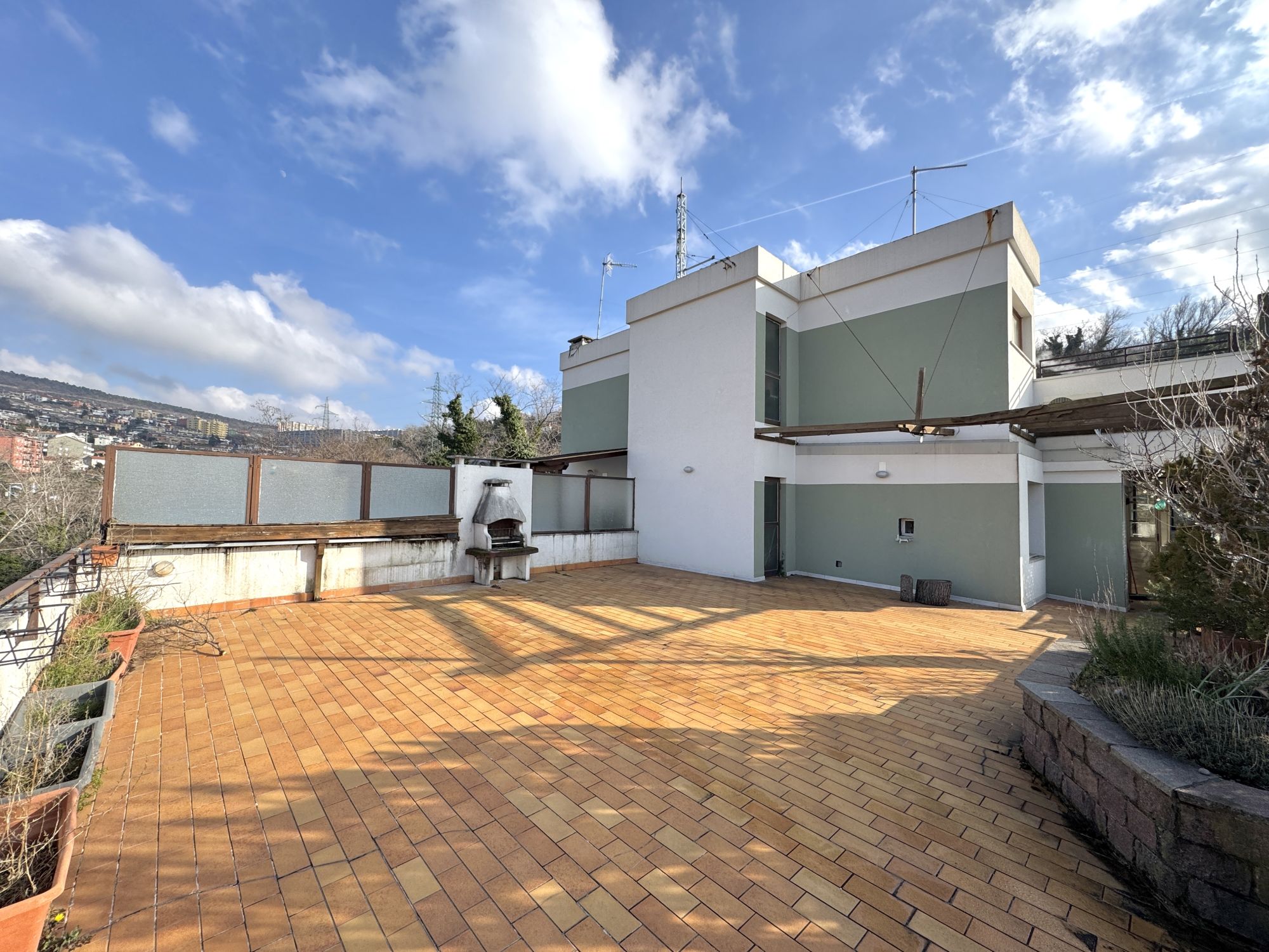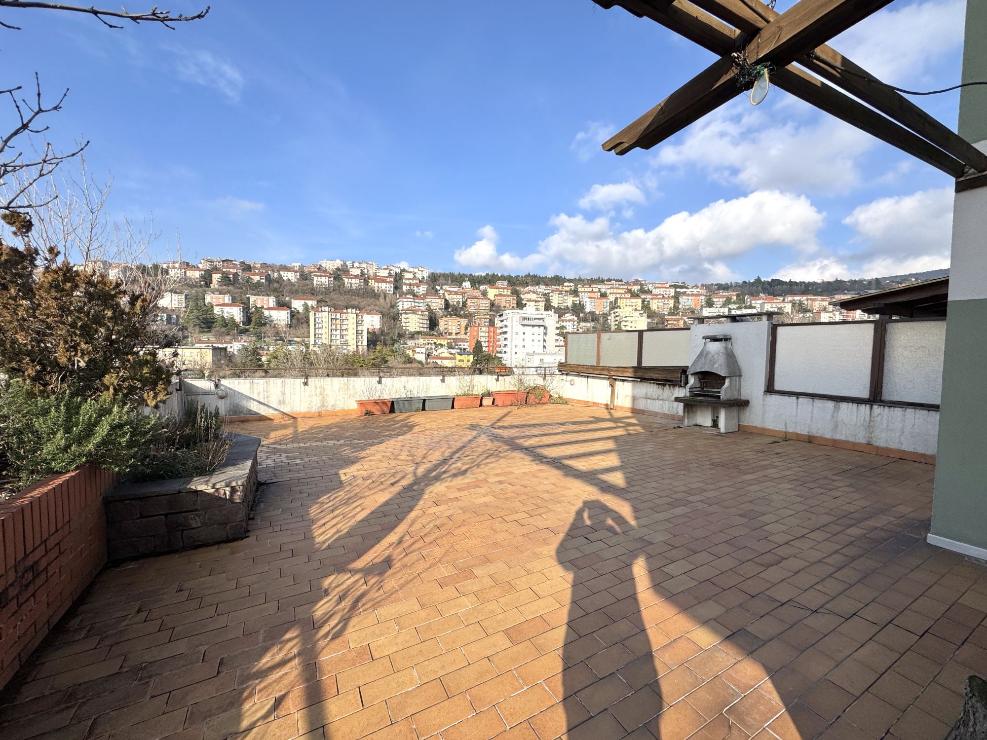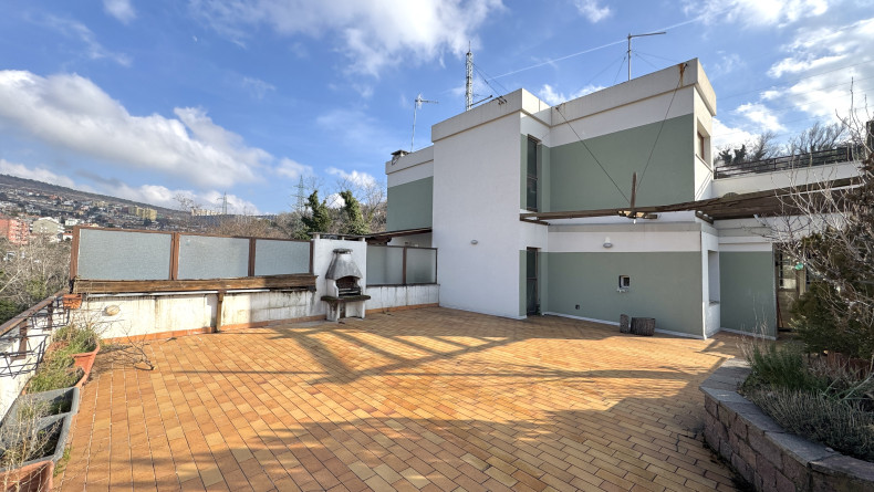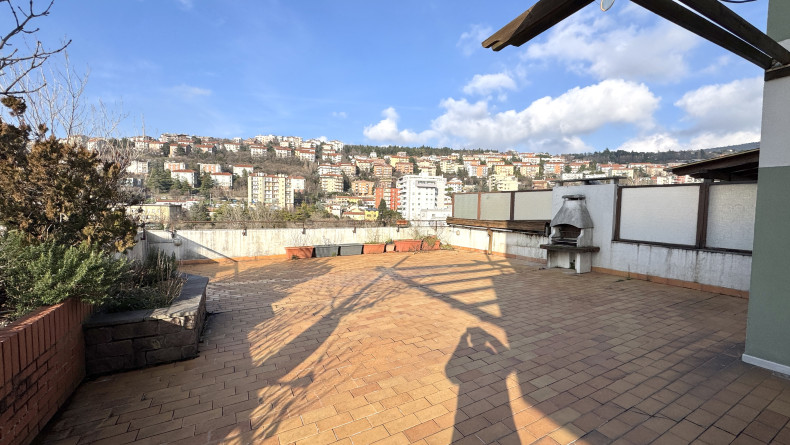 MONTEBELLO ATTICO PANORAMICO DI 90mq con terrazzo di mq 80, in palazzina con le facciate rifatte. E’ composto da ampio soggiorno, cucina, 2 stanze, bagno e uno strepitoso e ampio terrazzo panoramico dotato di barbecue. E’ soleggiato, tranquillo, immerso in un’oasi di pace. Viene consegnato arredato come da foto. E’ dotato di riscaldamento e acqua centralizzati, ascensore, porta blindata e posto auto in autorimessa. Richiesta 850+300. Studio Immobiliare Benedetti tel. 040/3476251 orario lu-ve 9-12 e 15.30-18.30